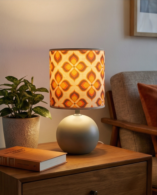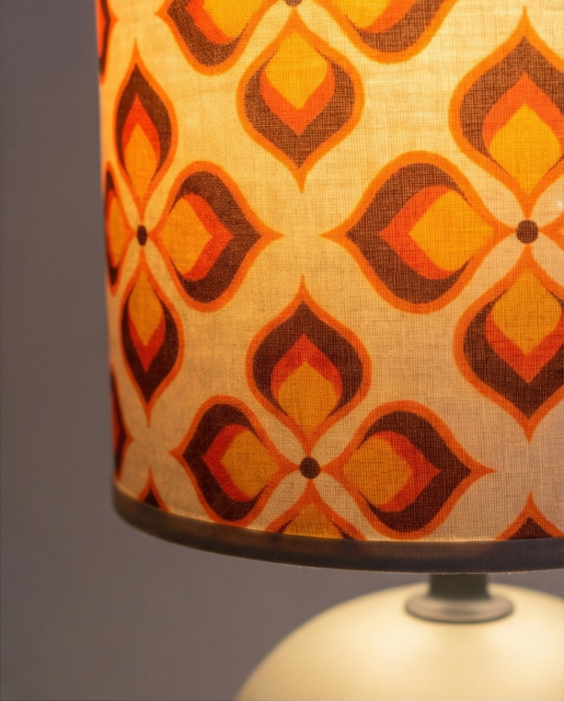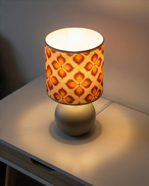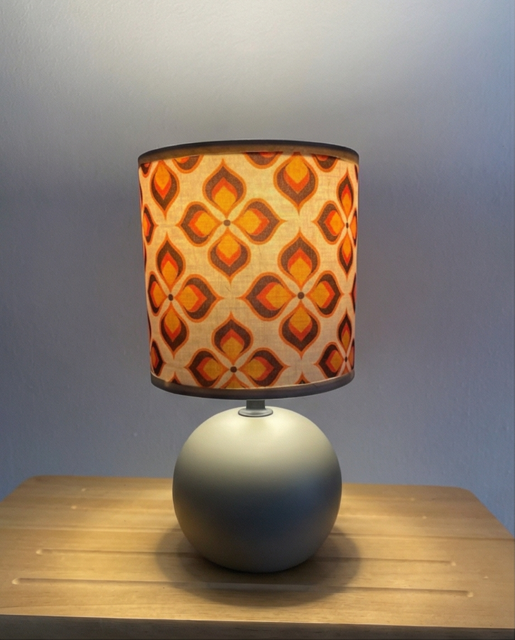 Cette lampe à poser rétro est parfaite pour apporter une touche décorative originale à ton intérieur. Son abat-jour au motif géométrique vintage dans des tons orange et chaleureux rappelle le style emblématique des années 70. Réalisé par mes soins avec du tissus