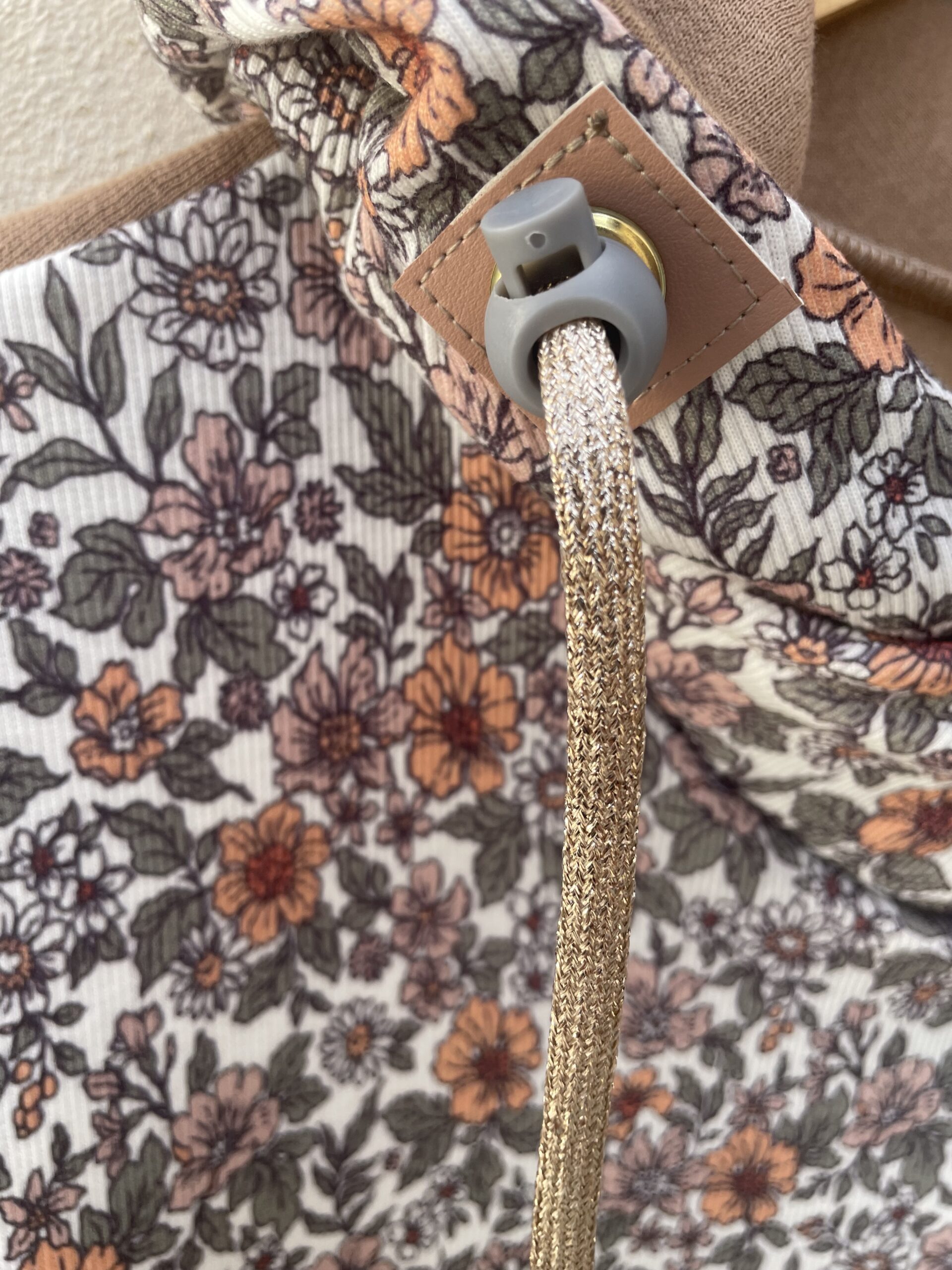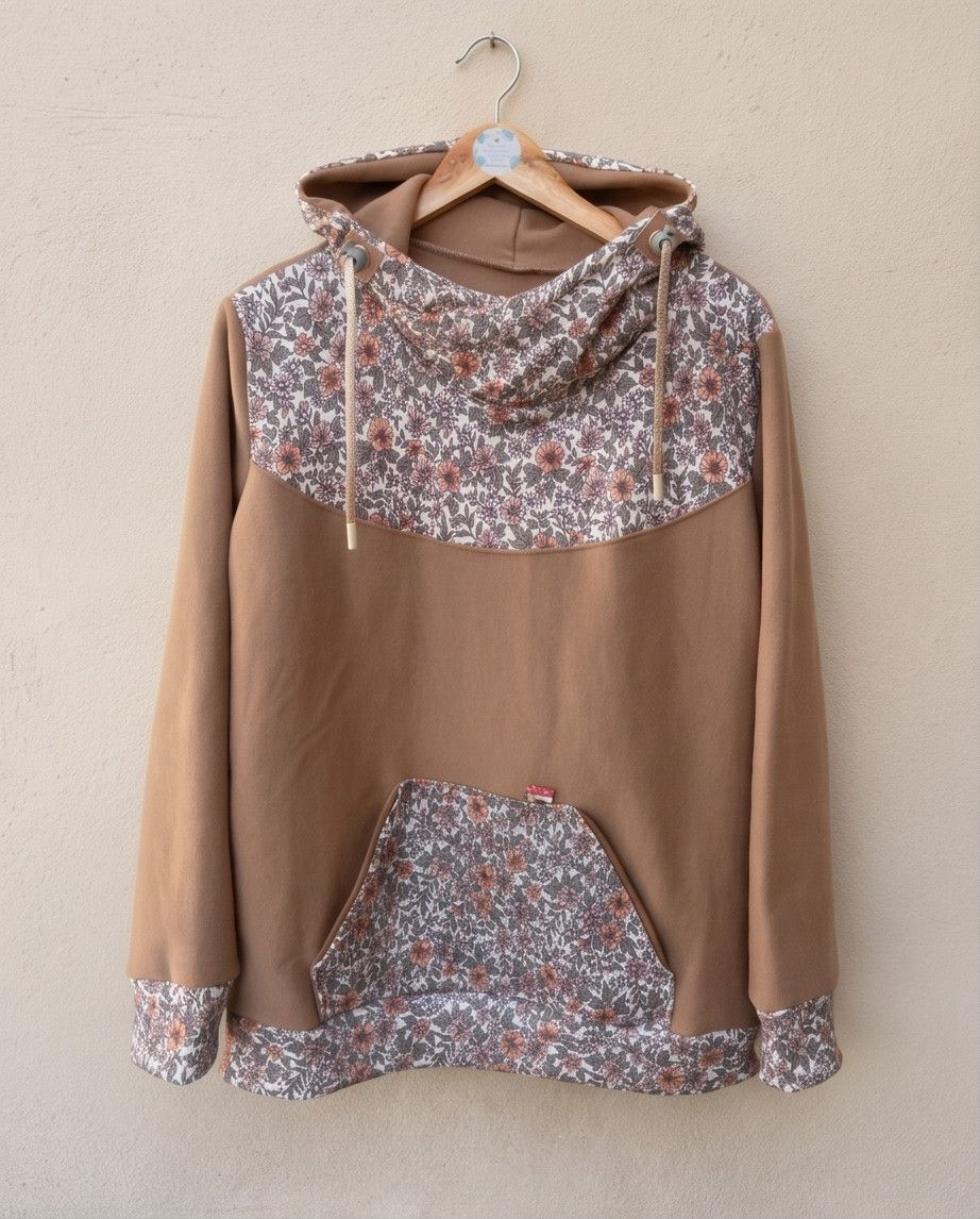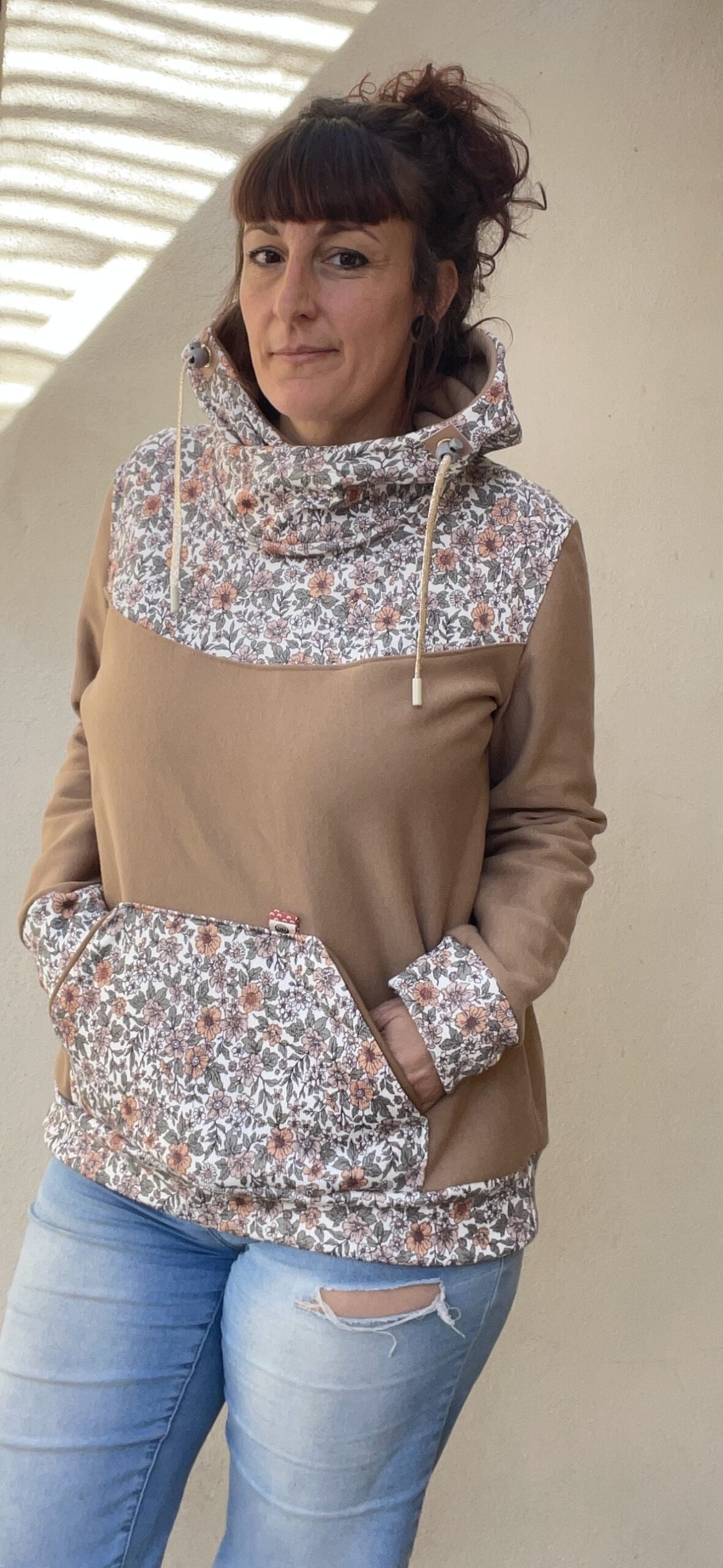 Une poche kangourou sur le devant, une grande capuche croisée avec oeillets et deux liens en coton bio et tirette en plastique recyclé de fabrication française.